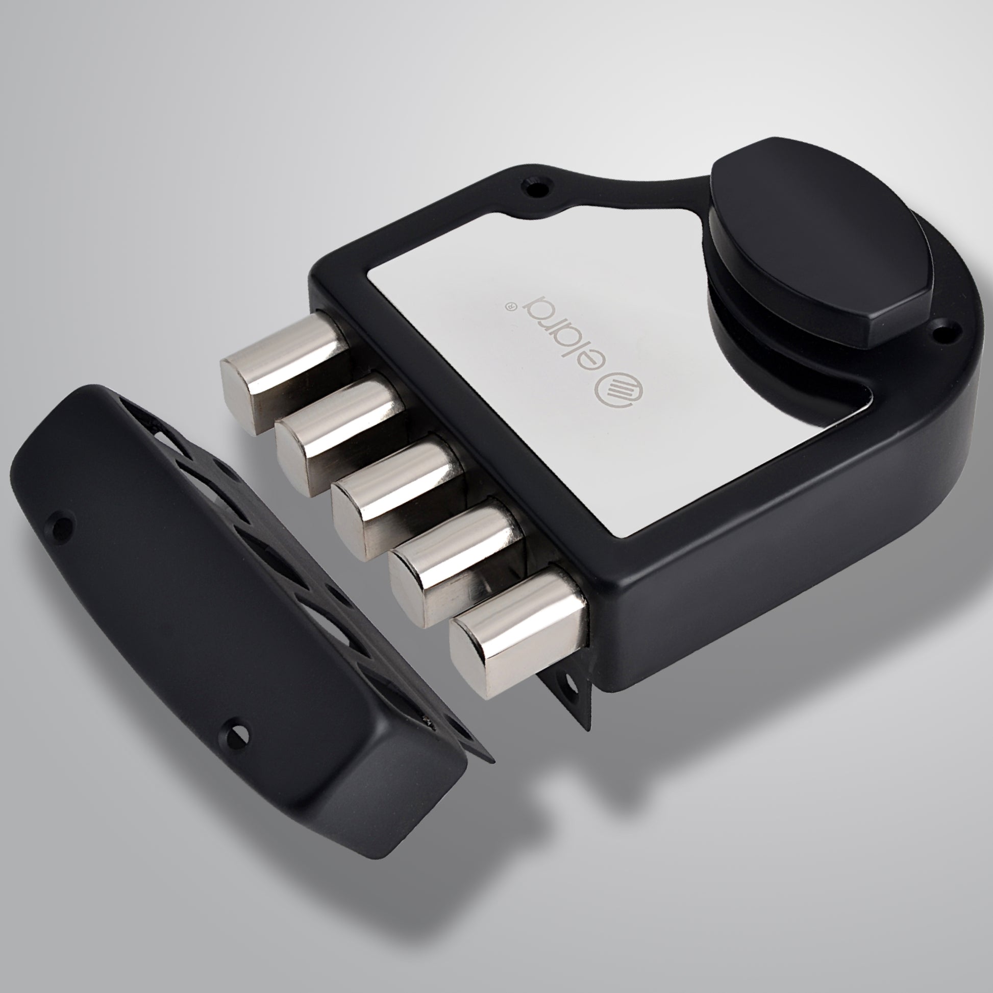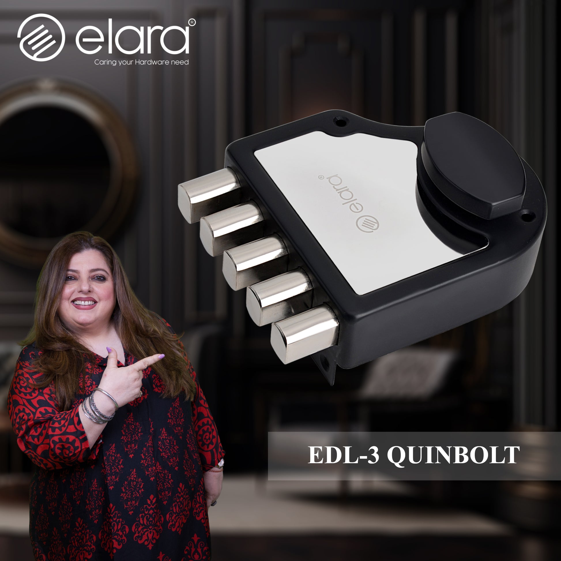 Elara Quinbolt 1CK Dead Bolt is an advanced door lock designed with a modern outside opening mechanism. The Five bolts of the lock are equipped with a double throw mechanism which ensures double security. The Quinbolt lock is made using a strong sheet metal body and its robust design provides inherent strength to your door lock. Elara Quinbolt 1CK is an inside opening lock. The body of the lock is designed using a high-quality Iron Sheet. Ultra cartridge is designed using brass material and has nickel plating. The lock features an extra long and wide reinforced receptacle which provides extra resistance from burglar attacks. The lock body and receptacle have an Electroplated lacquer finish which makes them scratch-resistant. Stay at ease as the lock has a Built-in anti-lockout system using a puller ring which prevents accidental lockouts. 20% wider and thicker bolts with a double throw of 20mm provide optimum security. Latch retraction by knob provides one-hand operation for ease of use. Multi-row, 14 pins, pin cylinder technology makes ultra lock unpickable. Over 100,000+ key combinations make a key unique to its own lock. High-precision computerized dimples make the Elara Quinbolt Lock key virtually unpickable. Extra long keys with bigger heads. Elara Quinbolt Dead lock key resists bending, is rustproof and reversible hence easy to use. Application: Entrance doors, wooden doors, balcony doors Suitable for: Left and right-handed doors, inside opening doors, 25mm to 60mm thick doors Operation: Lock can be unlocked by key from outside and knob from inside. About the Brand - Elara Locks has been protecting every home in India ever since 1947. We have products for all your needs. Padlocks, furniture locks, baggage locks, main door locks, and safety solutions for home, institution, and commercial needs. Design-led innovation and technology have been the backbone of our products ensuring safety for consumers in India and across the globe. Think safety, Think Elara.