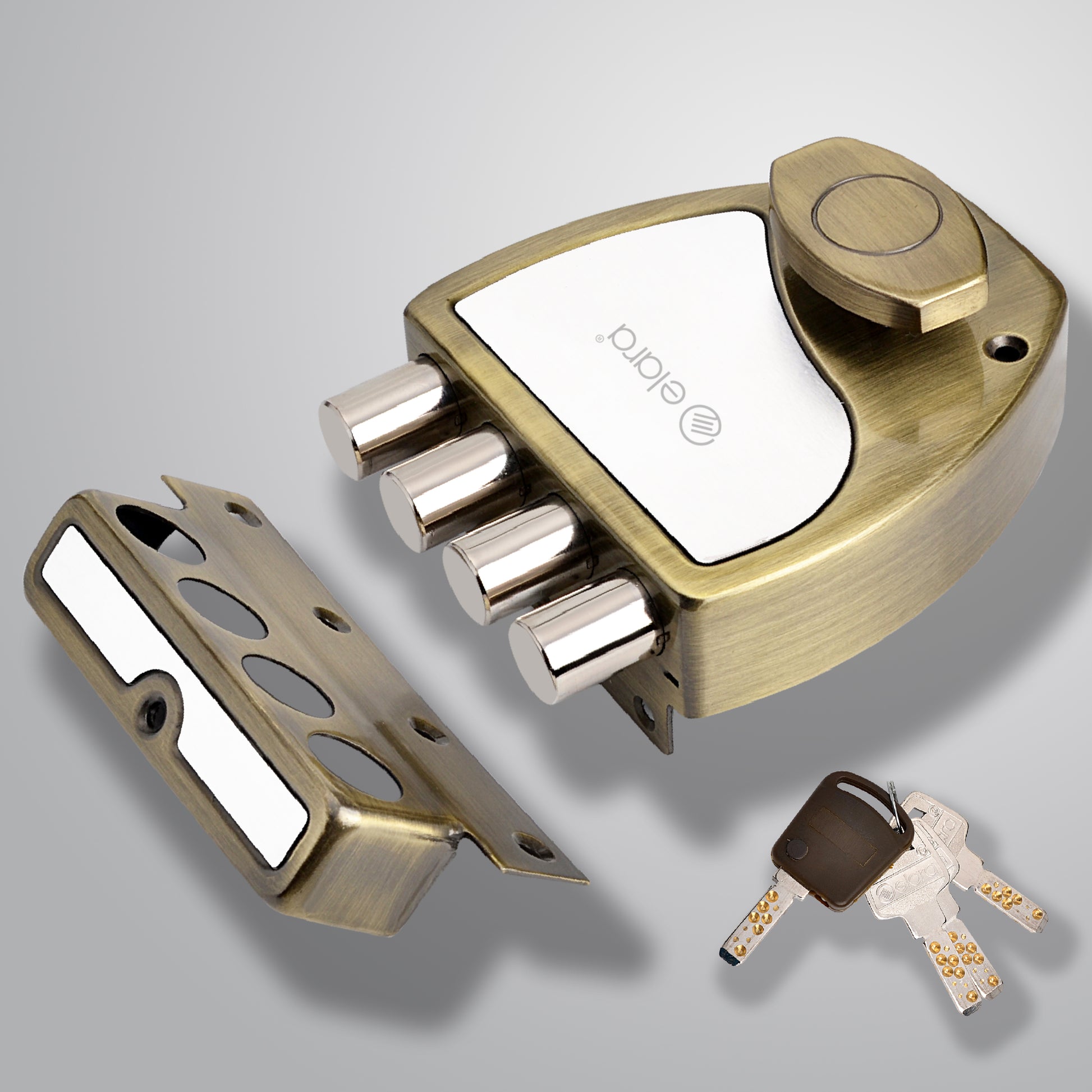Elara Quadbolt 1CK Dead Bolt (Four Bullet) is an advanced door lock designed with a modern outside opening mechanism. The Four bolts of the lock are equipped with a double throw mechanism which ensures double security. The Quadbolt lock is made using a strong sheet metal body and its robust design provides inherent strength to your door lock. Elara Quadbolt 1CK is an inside opening lock. The body of the lock is designed using a high-quality Iron Sheet. Ultra cartridge is designed using brass material and has nickel plating. The lock features an extra long and wide reinforced receptacle which provides extra resistance from burglar attacks. The lock body and receptacle have an Electroplated lacquer finish which makes them scratch-resistant. Stay at ease as the lock has a Built-in anti-lockout system using a puller ring which prevents accidental lockouts. 20% wider and thicker bolts with a double throw of 20mm provide optimum security. Latch retraction by knob provides one-hand operation for ease of use. Multi-row, 14 pins, pin cylinder technology makes ultra lock unpickable. Over 100,000+ key combinations make a key unique to its own lock. High-precision computerised dimples make thElara Quadbolt Lock key virtually unpickable. Extra long keys with bigger heads. Elara Quadbolt Dead lock key resists bending, is rustproof and reversible hence easy to use. Application: Entrance doors, wooden doors, balcony doors Suitable for: Left and right-handed doors, inside opening doors, 25mm to 60mm thick doors Operation: Lock can be unlocked by key from outside and knob from inside. About the Brand - Elara Locks has been protecting every home in India ever since 1947. We have products for all your needs. Padlocks, furniture locks, baggage locks, main door locks, safety solutions for home, institution and commercial needs. Design-led innovation and technology hav been the backbone of our products ensuring safety for consumers in India and across the globe. Think safety, Think Elara.