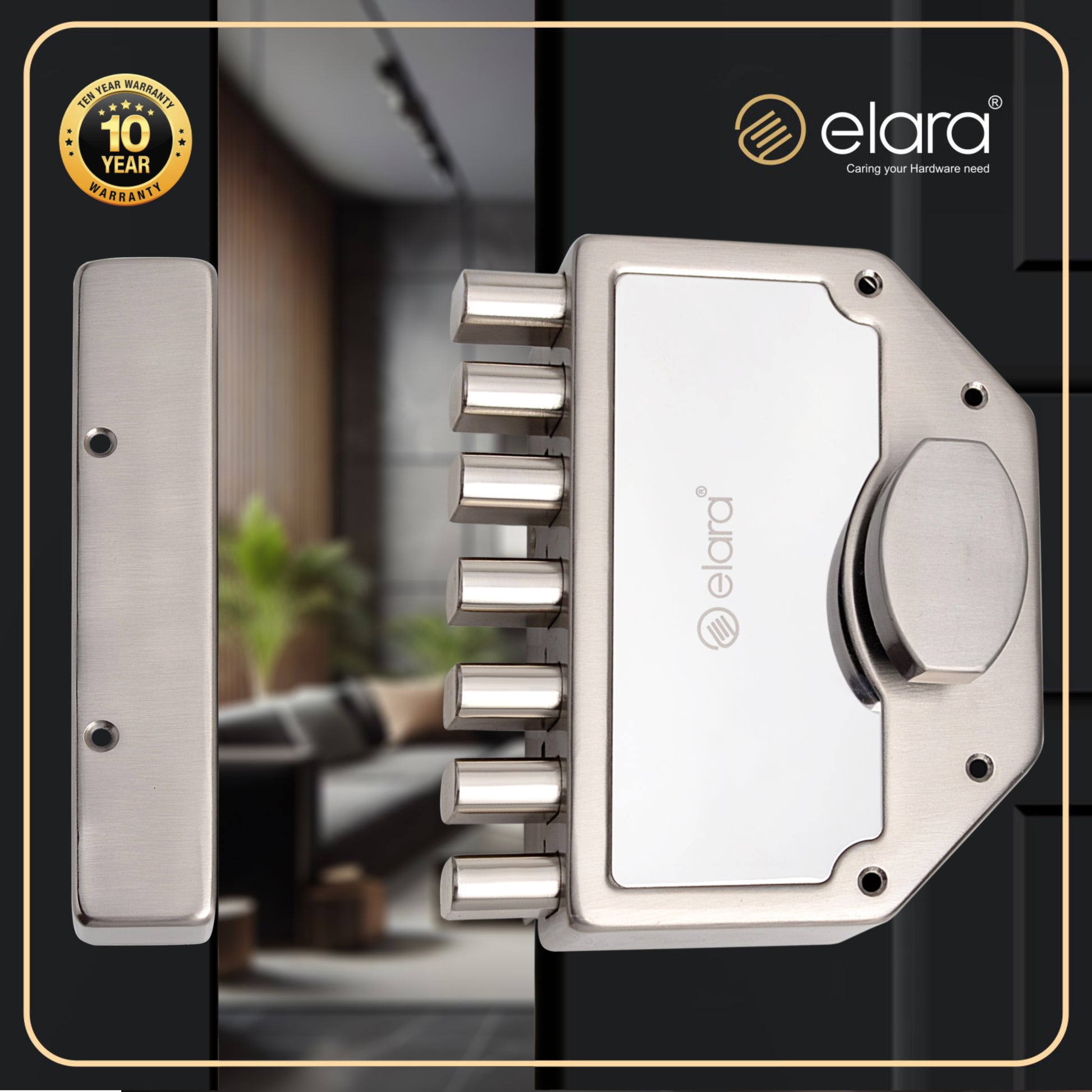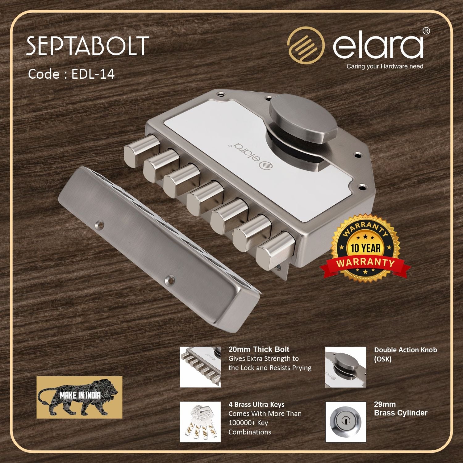 Elara Deadbolt 1CK Septabolt is an advanced door lock designed with a modern outside opening mechanism. The Seven bolt Dead Lock is equipped with a double throw mechanism which ensures double security. The Septabolt Deadbolt lock is made using a strong sheet metal body and its robust design provides inherent strength to your door lock. Elara Septabolt Deadbolt 1CK is an inside opening lock. The body of the lock is designed using a high-quality Iron Sheet. Ultra cartridge is designed using brass material and has nickel plating. The lock features an extra long and wide reinforced receptacle which provides extra resistance from burglar attacks. The lock body and receptacle have an Electroplated lacquer finish which makes them scratch-resistant. Stay at ease as the lock has a Built-in anti-lockout system using a puller ring which prevents accidental lockouts. 20% wider and thicker bolts with a double throw of 20mm provide optimum security. Latch retraction by knob provides one-hand operation for ease of use. Multi-row, 14 pins, pin cylinder technology makes ultra lock unpickable. Over 100,000+ key combinations make a key unique to its own lock. High-precision computerized dimples make the Elara Septabolt Lock key virtually unpickable. Extra long keys with bigger heads. Elara Septabolt Door lock key resists bending, is rustproof and reversible hence easy to use. Application: Entrance doors, wooden doors, balcony doors Suitable for: Left and right-handed doors, inside opening doors, 25mm to 60mm thick doors Operation: Lock can be unlocked by key from outside and knob from inside. About the Brand - Elara Locks has been protecting every home in India ever since 1947. We have products for all your needs. Padlocks, furniture locks, baggage locks, main door locks, and safety solutions for home, institution, and commercial needs. Design-led innovation and technology have been the backbone of our products ensuring safety for consumers in India and across the globe. Think safety,