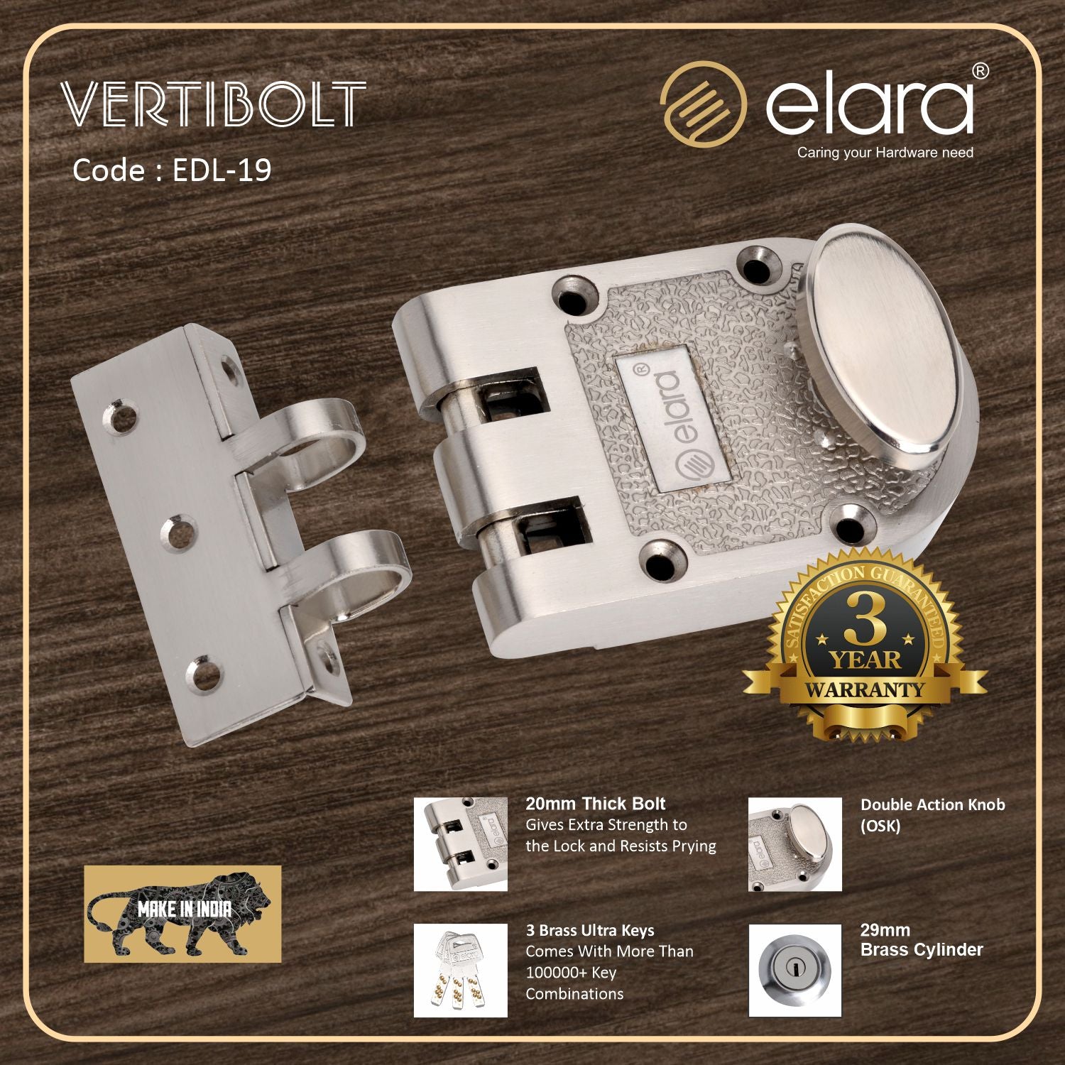 Elara Vertibolt 1CK Dead Bolt is an advanced door lock designed with a modern outside opening mechanism. The Double bolts of the lock are equipped with a double throw mechanism which ensures double security. The Vertibolt lock is made using a strong sheet metal body and its robust design provides inherent strength to your door lock. Elara Vertibolt 1CK is an inside opening lock. The body of the lock is designed using a high-quality Iron Sheet. Ultra cartridge is designed using brass material and has nickel plating. The lock features an extra long and wide reinforced receptacle which provides extra resistance from burglar attacks. The lock body and receptacle have an Electroplated lacquer finish which makes them scratch-resistant. Stay at ease as the lock has a Built-in anti-lockout system using a puller ring which prevents accidental lockouts. 20% wider and thicker bolts with a double throw of 20mm provide optimum security. Latch retraction by knob provides one-hand operation for ease of use. Multi-row, pin cylinder technology makes ultra lock unpickable. Over 100,000+ key combinations make a key unique to its lock. High-precision computerized dimples make the Elara Vertibolt Lock key virtually unpickable. Extra long keys with bigger heads. Elara Vertibolt Dead lock key resists bending, is rustproof and reversible hence easy to use. Application: Entrance doors, wooden doors, balcony doors Suitable for: Left and right-handed doors, inside opening doors, 25mm to 60mm thick doors Operation: Lock can be unlocked by key from outside and knob from inside. About the Brand - Elara Locks has been protecting every home in India ever since 1947. We have products for all your needs. Padlocks, furniture locks, baggage locks, main door locks, and safety solutions for home, institution, and commercial needs. Design-led innovation and technology have been the backbone of our products ensuring safety for consumers in India and across the globe. Think safety, Think Elara.